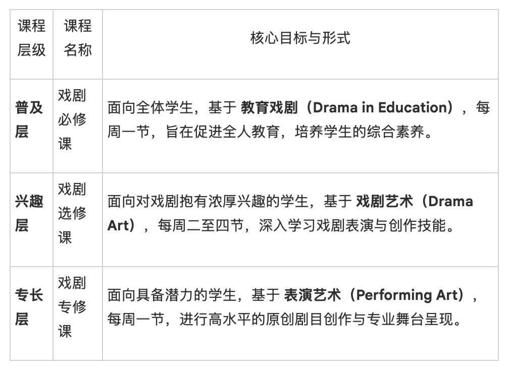 这一体系确保了每一位学生都能享受到戏剧教育的基础滋养,同时也为有兴趣和特长的学生提供了向上发展的专业通道。
